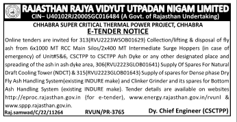 Tender for 313[RVU2223WSOB01629) Collection/lifting & disposal of fly ash from 6×1000 MT RCC Main Silos/2×400 MT Intermediate Surge Hoppers (in case of emergency) of Unit#5&6, CSCTPP to CSCTPP Ash Dyke or any other designated place and spreading of the ash in ash dyke area, 306(RVU2223GLOB01641) Supply Of Spares For Natural Draft Cooling Tower (NDCT) & 315(RVU2223GLOB01643) Supply of spares for Dense phase Dry Fly Ash Handling System(existing INDURE make) and Clinker Grinder and its spares for Bottom Ash Handling System (existing INDURE make).