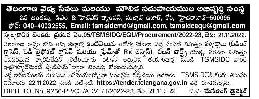 supply of Spectacles (Reading Glasses, Ready Bifocal Glasses and Frames RX Lenses), Vision Charts for distribution at Kanti Velak Arogya Camps in all districts of Telangana State