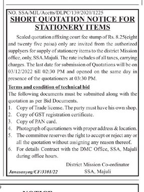 supplyers for supply of stationery items to the district Mission