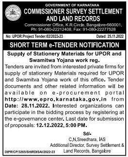 Tender for supply of stationery Materials required for UPOR and Swamitva Yojana work of this office.