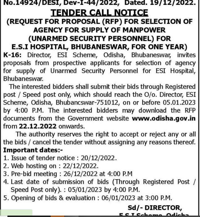 Tender for supply of Unarmed Security Personnel for ESI Hospital, Bhubaneswar. The interested bidders shall submit their bids through Registered post/Speed post only, which should reach the O/o. Director
