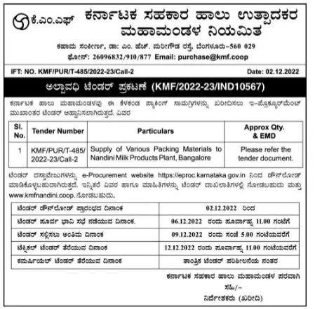 Tender for Supply of Various Packing Materials to Nandini Milk Products Plant, Bangalore