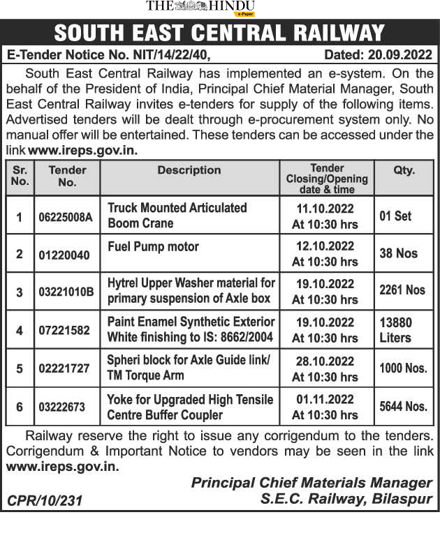 Tender for supply of Yoke for Upgraded High Tensile Centre Buffer Coupler 5644 Nos