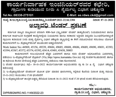 Tender for Supply Project works under Rural Drinking Water and Sanitation Division Chikkodi are invited through e-procurement.