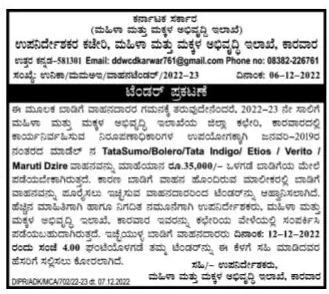 Tender for supply rental vehicles to owners with rental vehicles. For further information and prescribed form contact Deputy Director, Women and Child Development Department, Karwar during office hours. is obtainable. Willing Hire Vehicle Owners