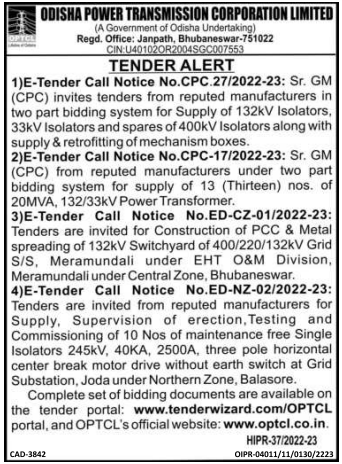 tenders from reputed manufacturers in two part bidding system for Supply of 132kV Isolators, 33kV Isolators and spares of 400kV Isolators along with supply & retrofitting of mechanism boxes.