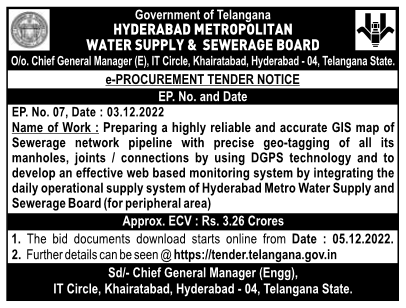 Preparing a highly reliable and accurate GIS map of Sewerage network pipeline with precise geo-tagging of all its manholes, joints / connections by using DGPS technology and to develop an effective web based monitoring system by integrating the daily operational supply system of Hyderabad Metro Water Supply and Sewerage Board (for peripheral area)