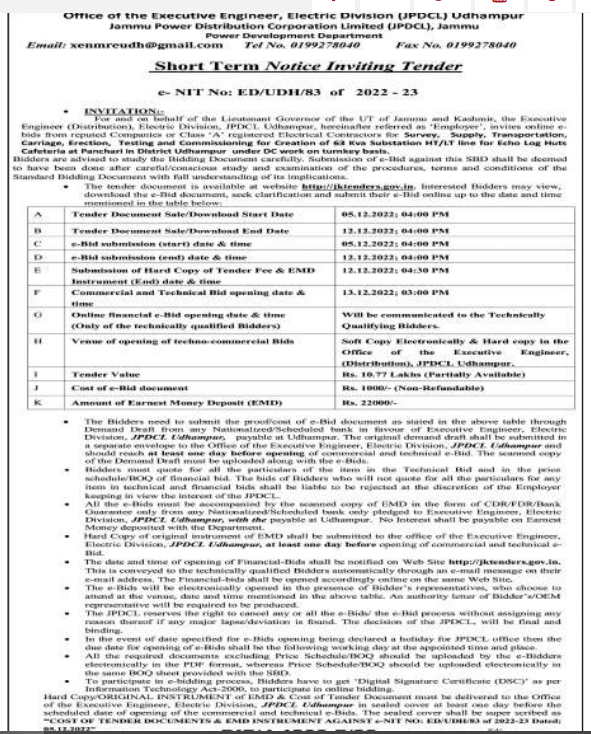Tender for Supply, Transportation, Carriage, Erection, Testing and Commissioning for Creation of 63 Kva Substation HT/LT line for Echo Log Huts Cafeteria at Panchari in District Udhampur under DC work on turnkey basis.