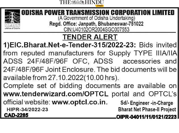 Bids invited from reputed manufacturers for Supply TYPE IIIA/IIA ADSS 24F/48F/96F OFC, ADSS accessories and 24F/48F/96F Joint Enclosure. The bid documents will be available from 27.10.2022(10.00 hrs).