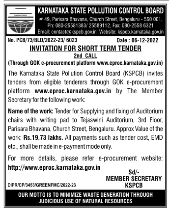Tender for Supplying and fixing of Auditorium chairs with writing pad to Tejaswini Auditorium, 3rd Floor, Parisara Bhavana, Church Street, Bengaluru.