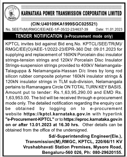 Tender for supplying and replacement of 160KN Porcelain disc insulator strings-tension strings and 120kV Porcelain Disc Insulator Strings-suspension strings provided to 400kV Nelamangala- Talaguppa & Nelamangala-Hassan D/c lines by long rod silicon rubber composite polymer 160kN insulator strings & 120kN insulator strings in TLM sub-division, Nelamangala pertains to Ramanagara Circle ON TOTAL TURN KEY BASIS.