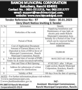 Tender for Supplying Installation and Maimenance of rope light on electric pole under Ranchi Municipal Corporation Area
