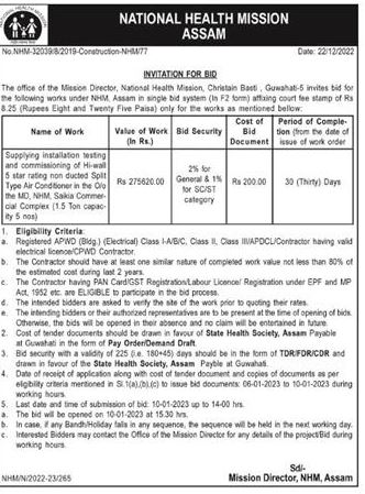 Tender for Supplying installation testing and commissioning of Hi-wall 5 star rating non ducted Split Type Air Conditioner in the Olo the MD, NHM. Sakia Commer cal Complex (1.5 Ton capac ity 5 nos)