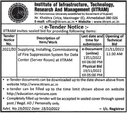 Tender for Supplying, Installing, Commissioning of Fire Suppression System for Data Center (Server Room) at IITRAM