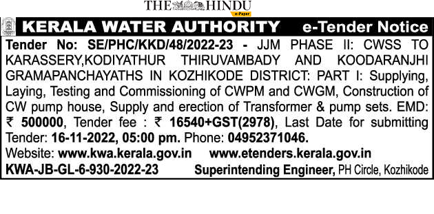 Tender for Supplying, Laying, Testing and Commissioning of CWPM and CWGM, Construction of CW pump house, Supply and erection of Transformer & pump sets.