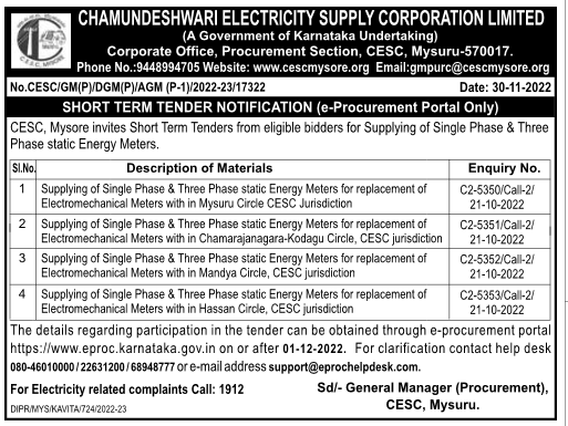 Tender for Supplying of Single Phase & Three Phase static Energy Meters for replacement of Electromechanical Meters with in Mysuru Circle CESC Jurisdiction