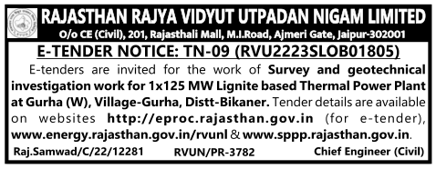 Survey and geotechnical investigation work for 1×125 MW Lignite based Thermal Power Plant at Gurha (W), Village-Gurha, Distt-Bikaner.