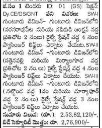 Installation of 4 Nos. Passenger Lifts at Railway Station (2 Nos. at Narasaraopeta and Nadikudi Junction) in Guntur Division. SWI Guntur Division – Installation of 4 Nos. Passenger Lifts at Railway Stations in Guntur Division (2 Nos. each at Sattenapally and Miryalaguda). SWIII Guntur Division – Installation of 3 passenger lifts at railway station (1 at Nalgonda and 2 at Markapur) in Guntur Division.