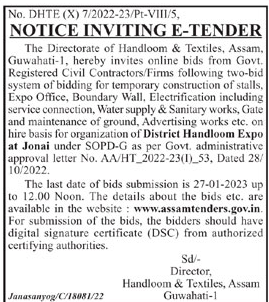 Tender for system of bidding for temporary construction of stalls, Expo Office, Boundary Wall, Electrification including service connection, Water supply & Sanitary works, Gate and maintenance of ground, Advertising works etc.