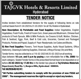 contract basis from 01.04.2023 to 31.03.2024 for all TAJ Hotels in Hyderabad.