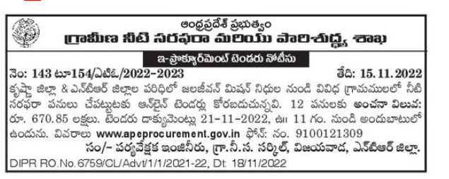 taking up water supply works in various villages from Jaljeevan Mission funds in Krishna District & NTR Districts.