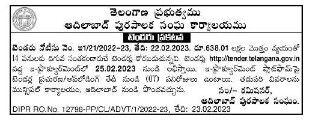 Tender Notice No. 01/21/2022-23, Date: 22.02.2023. Tenders are being invited by the undersigned for 11 works at a total cost of Rs.636.01 lakhs. Tenders will be available from 25.02.2023 under -Procurement at http:tender.telangana.gov.in. The work shall be valid from the date (UT) of publication/offloading of tenders on the e-procurement platform.