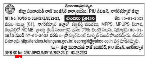 Tender for Telangana Govt Office of District Panchayat Raj Engineer, PIU Division, Nagar Kurnool District.