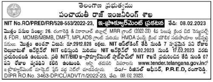 | Total No. of Works: 26. BT Renewals & FDR under 4th Call of MRR Grant (2002-23) in Rangareddy & Vikarabad Districts.
