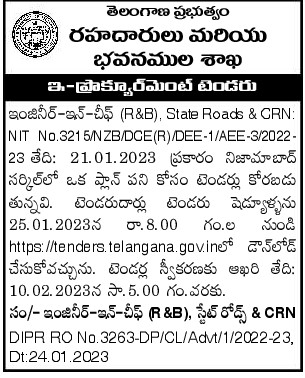 NIT No.3215/NZB/DCE(R)/DEE-1/AEE-3/2022-