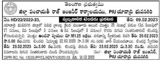 Tender for Telangana Govt Zilla Panchayat Raj Engineer Office, PIU Yadadri Bhuvanagiri