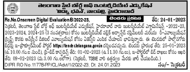 The Secretary, Telangana State Board of Intermediate Education, Hyderabad intends to select an agency for