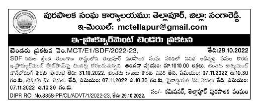 Tender for Telapur Municipal Corporation of Telangana State under SDF Funds Estimated Cost: Rs.1010.00 Lakhs,