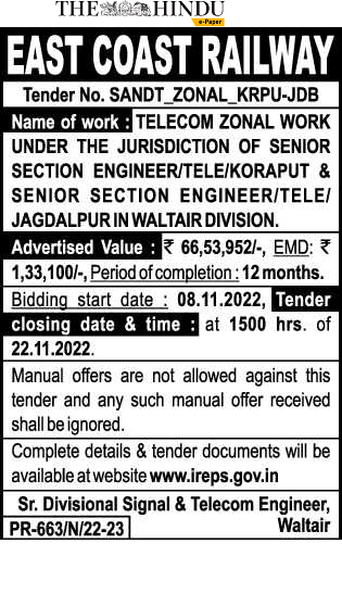 Tender for TELECOM ZONAL WORK UNDER THE JURISDICTION OF SENIOR SECTION ENGINEER/TELE/KORAPUT & SENIOR SECTION ENGINEER/TELE/JAGDALPUR IN WALTAIR DIVISION.