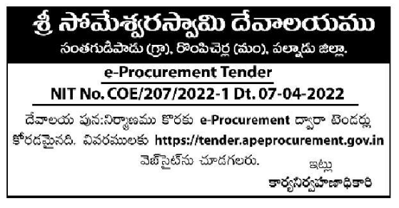 Tender for temple reconstruction in Sri Someswara Swamy Temple