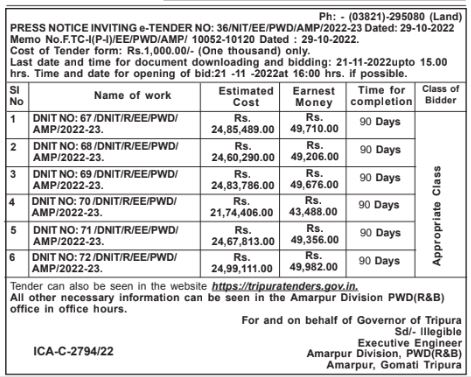 TENDER FOR Tender can also be seen in the website https://tripuratenders.gov.in. All other necessary information can be seen in the Amarpur Division PWD(R&B) office in office hours.