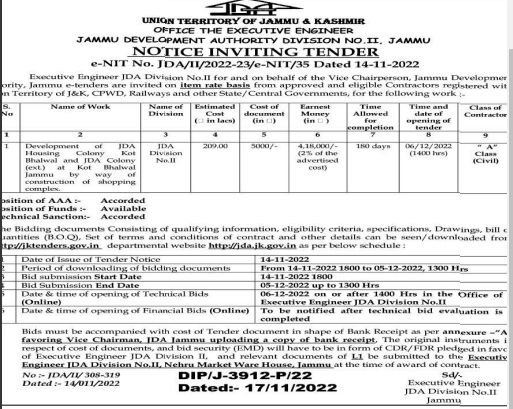 Tender for Tender for Development of JDA Cat Housing Colony Bhalwal and JDA Colony at Kot Bhalwal Jammu by complex.