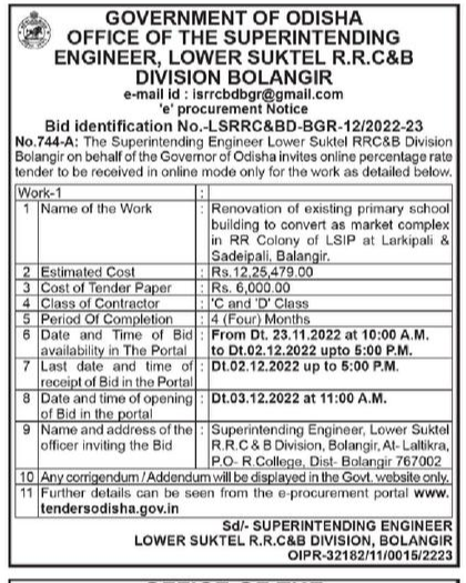 Tender for Tender for Renovation of existing primary school building to convert as market complex in RR Colony of LSIP at Larkipali & Sadeipali, Balangir.