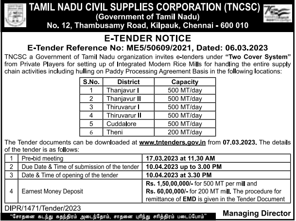 Tender for Thanjavur II 500 MT/day.under Two Cover System from Private Players for setting up of Integrated Modern Rice Mills for handling the entire supply chain activities including hulling on Paddy Processing Agreement Basis in the following locations: