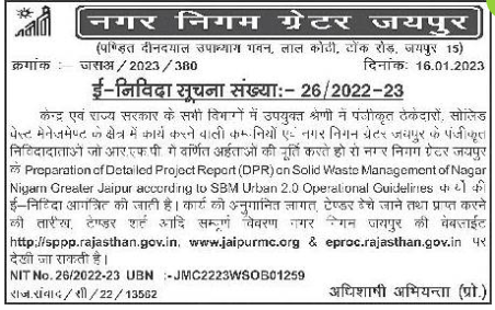 Tender for the appropriate category has registered contractors, girls working in the field of solid pest management and registered tenderers of Municipal Corporation Greater Jaipur. F. Municipal Corporation of Greater Jaipur Preparation of Detailed Project