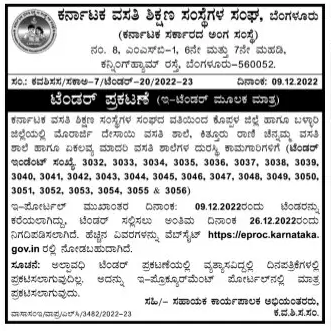 Tender for the Association of Karnataka Residential Educational Institutions for the repair works of Morarji Desai Residential School, Kittur Rani Chennamma Residential School and Eklavya Model Residential School in Koppal district and Bellary district.