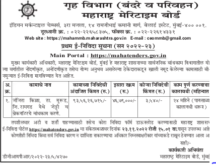 The Chief Executive Officer, Maharashtra Maritime Board, Mumbai invites e-tenders in B-pattern for the work mentioned