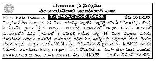 Tadwai, Rama Reddy, Sadashivanagar, Gandhari and Lingampet under 2 BHK Grant of Ellareddy Assembly Constituency in Kamareddy District Rural houses for 2 BH in various villages in mandals (14) no. Tenders are being sought for the construction of and retail fish market at Sadashivanagar and Ramareddy villages.