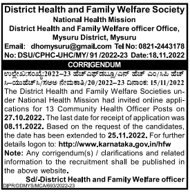 Tender for The District Health and Family Welfare Societies un- der National Health Mission had invited online appli- cations for 13 Community Health Officer Posts