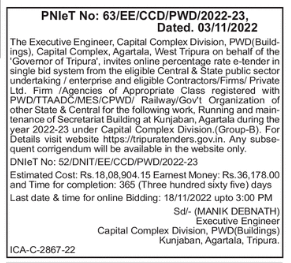 Tender for the eligible Central & State public sector undertaking/enterprise and eligible Contractors/Firms/ Private Ltd. Firm /Agencies of Appropriate Class registered with PWD/TTAADC/MES/CPWD