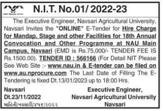 Tender for The Executive Engineer, Navsari Agricultural University. Navsari Invites the ONLINE E-Tender for Hire Charge for Mandap, Stage and other Facilities for 18th Annual Convocation and Other Programme at NAU Main