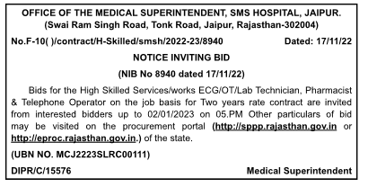 Tender for the High Skilled Services/works ECG/OT/Lab Technician, Pharmacist & Telephone Operator on the job basis for Two years rate contract