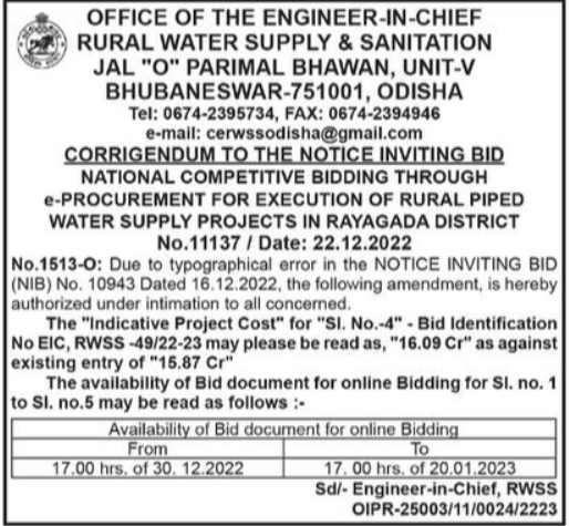Tender for The “Indicative Project Cost” for “Sl. No.-4” – Bid Identification No EIC, RWSS-49/22-23 may please be read as, “16.09 Cr” as against existing entry of “15.87 Cr”