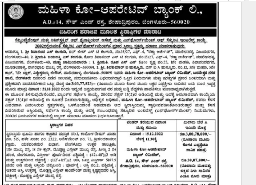Tender for the Maintenance of Immovable Property Land and Building No.1 Corporation Account No. 515, old account no. 2322, Assessment no. 73, SRIGANDHAKAVALU GAMA, YASWANTPURA DIVISION, BANGALORE UT. TAL