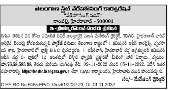 Tender for THE MANAGING DIRECTOR, TSWC, HYDERABAD FROM THE REGISTERED CIVIL CONTRACTORS FOR THE BELOW NAMED WORK PACKAGE WORKS IN THE STATE OF TELANGANA