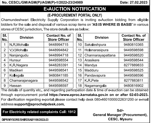 Tender for the sale and disposal of various scrap items on ‘AS IS WHERE IS BASIS’ in various stores of CESC jurisdiction.